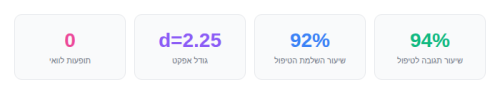 גודל ההשפעה הוא מדד שמראה כמה חזק השינוי שהטיפול יצר: מעל 0.8 נחשב "גדול", ובמחקר הזה קיבלנו 2.25 - כלומר שיפור חזק מאוד שלא נובע ממקריות (Cohen's d = 0.91 בסיום הטיפול, 2.25 במעקב 6 חודשים). המשמעות היא שהילדים קיבלו כלים והשתפרו עוד במשך חצי שנה.